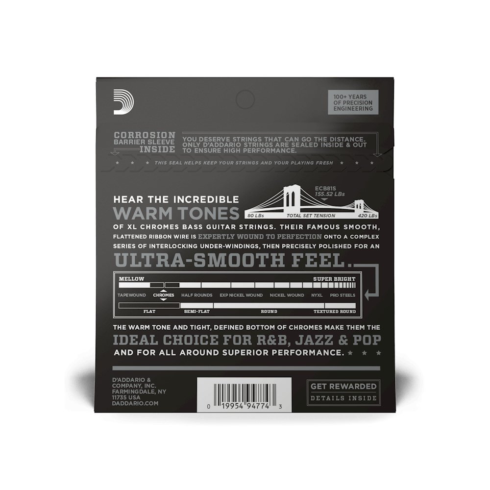 ECB81S, a short scale version of D'Addario's best-selling Flatwound bass strings, are known for their warm, mellow tone and smooth polished feel. Chromes deliver a deep, rich low bottom end which makes them the flat wound choice of Jazz, R&B and Pop musicians. Fits short scale basses with a string scale length of up to 32 inches.