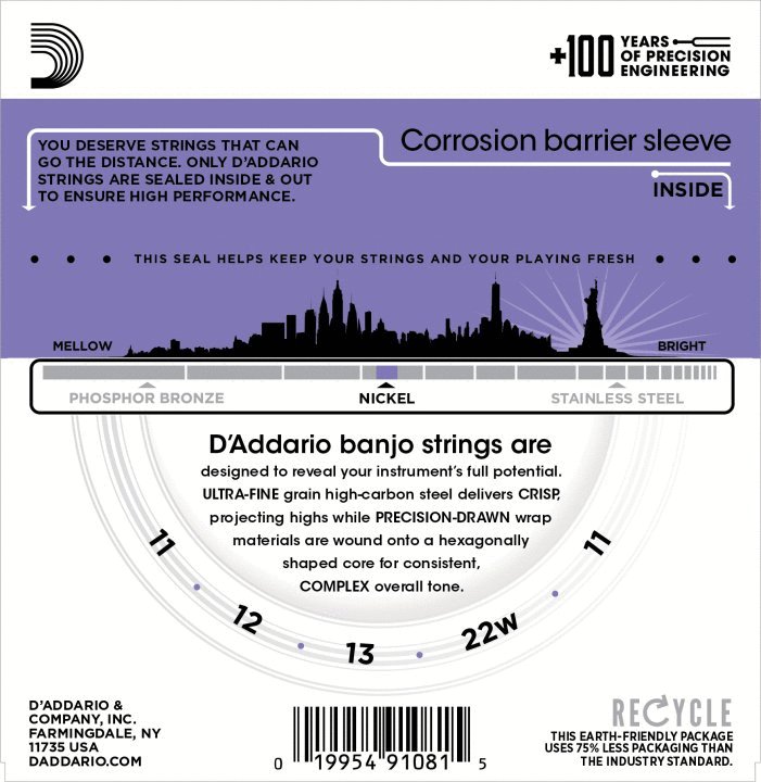 | D'Addario heaviest gauge of 5-string banjo strings, delivers increased resistance and projection Loopend construction for universal fit Nickelplated steel for bright tone, smooth feel and long life | Made in the U.S.A. for the highest quality and performance String Gauges: Plain Steel .011, .012, .013, Nickel Wound .022, Plain Steel .011 Environmentally friendly, corrosion resistant packaging for strings that are always fresh |