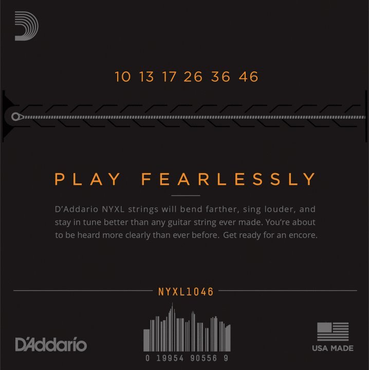 | NYXL’s feature D’Addario’s exclusive New York manufactured, high carbon steel alloy for unprecedented strength – Play Fearlessly Improved tuning stability compared to traditional nickel wound strings - get in tune faster, stay in tune better Wound strings with enhanced mid-range frequency response in the 1 - 3.5 kHz range – more presence and crunch to cut through the mix | NYXL1046 offers an ideal combination of comfortable playability and ideal electric tone: Plain Steel .010, .013, .017, Nickel Wound .026, .036, .046 Environmentally friendly, corrosion resistant packaging for strings that are always fresh |