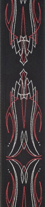 Intricate silver and red designs over a black pattern make the Planet Waves Chopper strap the perfect accent to any guitar.